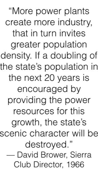 “If a doubling of the state’s population in the next 20 years is to be encouraged by providing the power resources for this growth,” wrote David Brower, who was Executive Director of the Sierra Club, “the state’s scenic character will be destroyed. More power plants create more industry, that in turn invites greater population density.”