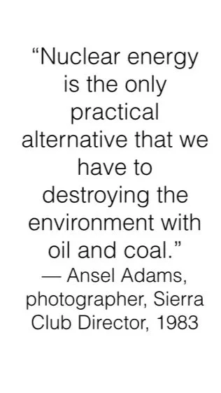Few people realize that up until the early-seventies, environmentalists including the Sierra Club itself was pro-nuclear. “Nuclear energy is the only practical alternative that we have to destroying the environment with oil and coal,” said famed nature photographer and Sierra Club Director, Ansel Adams.