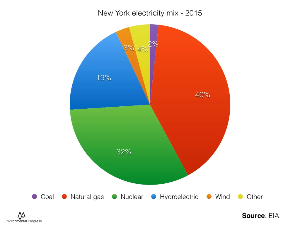 Instead, New York's low-carbon electricity goal is to generate 50 percent of its electricity from renewables by 2030 — which is less than it gets today from nuclear (32%), hydro (19%), wind (3%) and solar (less than 1%).
