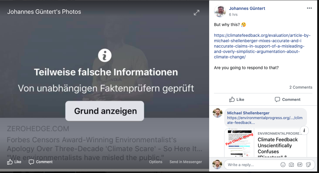 I am formally requesting an investigation of this action by Facebook. Climate Feedback got it wrong, and thus Facebook got it wrong. Many people only get their news from Facebook, which exercises extraordinary market power, and power over how people decide what is true and false. I am confident that you take your extraordinary powers extremely seriously.