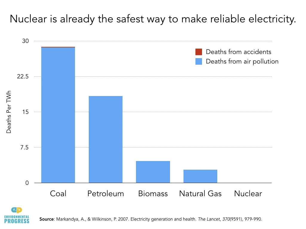 Nuclear is the safest way of producing reliable electricity, according to every major scientific review, including the British medical journal Lancet. What all of these studies show is that over 95 percent of the deaths from energy production are from pollution. A tiny number are from accidents, whether coal mine collapses, natural gas explosions, or nuclear meltdowns. As such, zero-carbon energy sources in general, from hydro to solar to wind to nuclear, result in very few deaths.