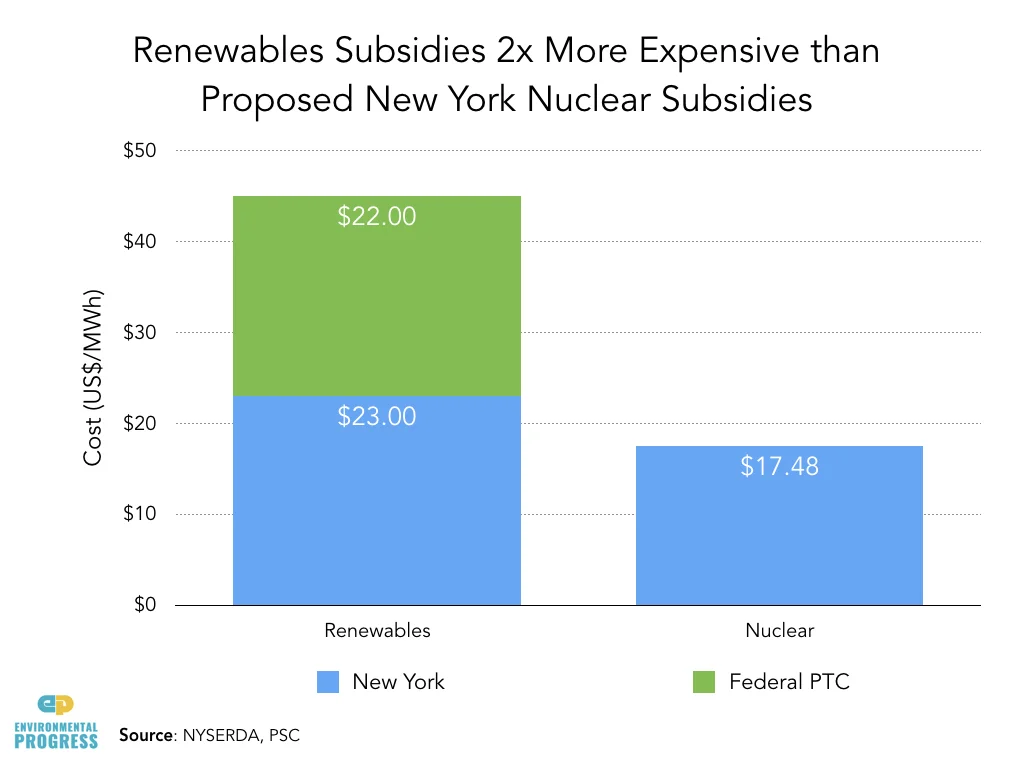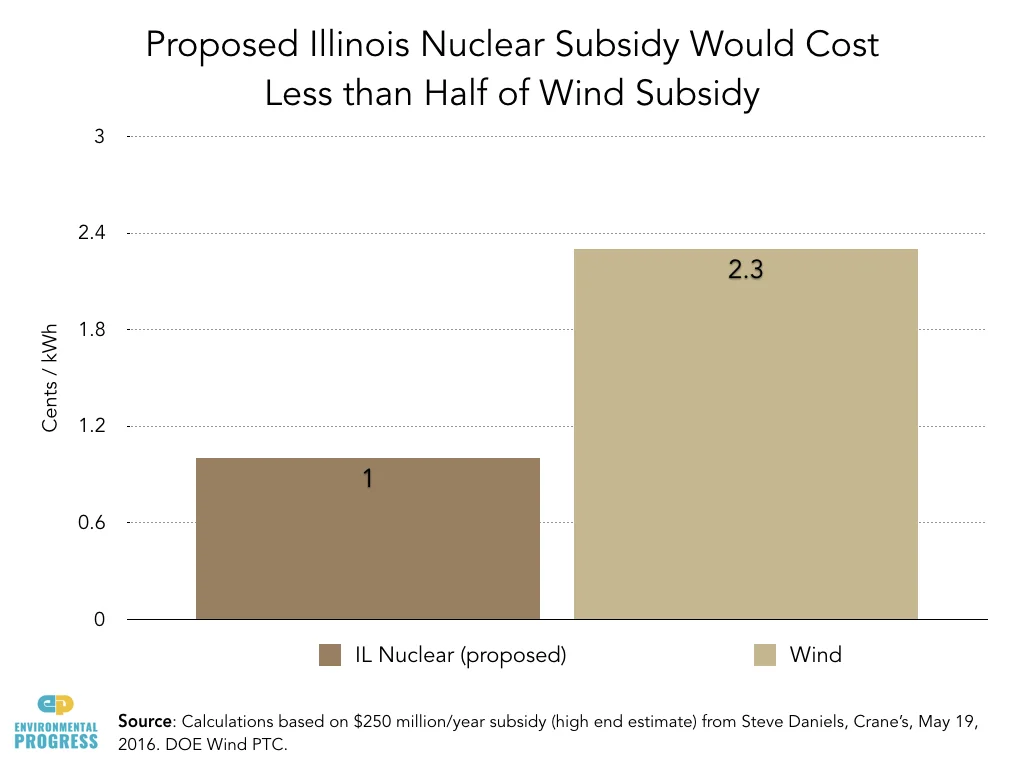 Yes, in some cases, but they are always far less than what solar and wind receive. In New York, the proposed subsidy for nuclear is half the existing subsidies for renewables. In Illinois, the subsidy required to keep the Clinton and Quad nuclear plants open amounts to 1 cent/KWh, a small fraction of the 2.3 cents/KWh Production Tax Credit (PTC), one of several subsidies available for renewable sources. And as natural gas prices rise, keeping nuclear plants on-line will protect consumers and industries from future price shocks.